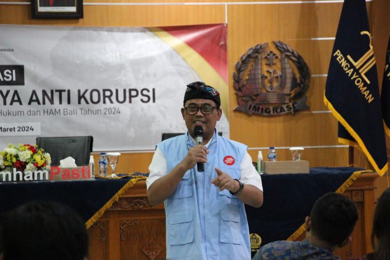 FORUMKeadilanbali.com – Meningkatkan pemahaman seluruh jajaran guna terwujudnya tata kelola pemerintahan bersih, transparan, dan berbudaya anti korupsi, Kanwil Kemenkumham Bali menggelar sosialisasi pembangunan budaya anti korupsi 2024, di Aula Kantor Imigrasi Kelas I TPI Denpsar, Kamis, (28/3).