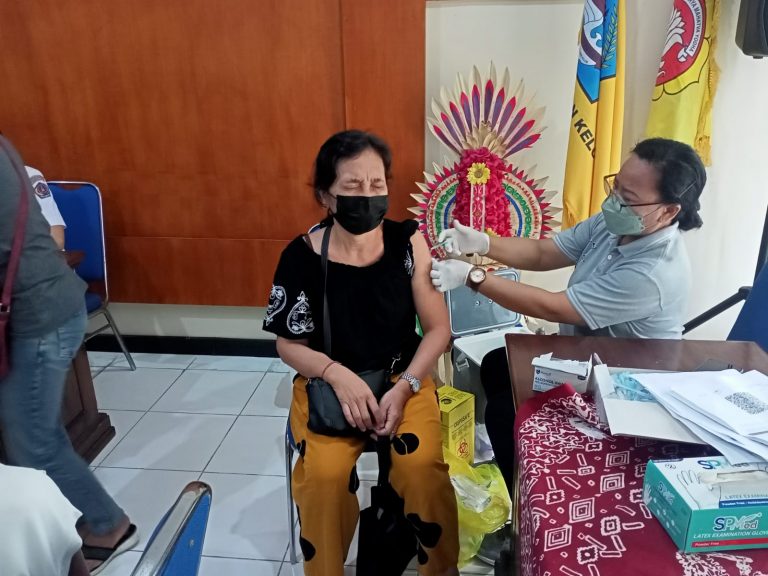 FORUM Keadilan Bali – Guna mendukung program Pemkot Denpasar dalam percepatan penanganan Covid-19 serta menekan jumlah penyebaran virus corona di Kota Denpasar, Desa Pemecutan Kelod menggelar vaksinasi massal di kantor desa setempat, Kamis (7/7).