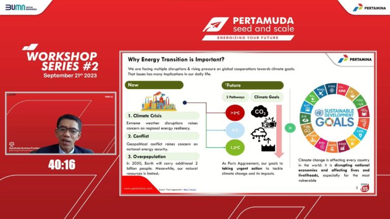 Harsono Budi Santoso memaparkan, workshop diikuti 771 dari 314 perguruan tinggi serta peserta umum ini, bagaimana Pertamina dalam sejarahnya memiliki kompetensi organisasi saat tumbuh hingga berkembang dan bisa sustain. Secara teknologi Pertamina jauh lebih siap dibandingkan 10 tahun lalu. Selama 15 tahun, bisnis Pertamina mengalami perubahan bisnis yang dilakukan Pertamina sebagai contoh perubahan penjualan minyak tanah menjadi LPG dengan tujuan berkontribusi dalam pengurangan climate crisis. Kemudian perubahan konvensional oil menjadi biodiesel sebagai bentuk kontribusi pengurangan gas emisi.