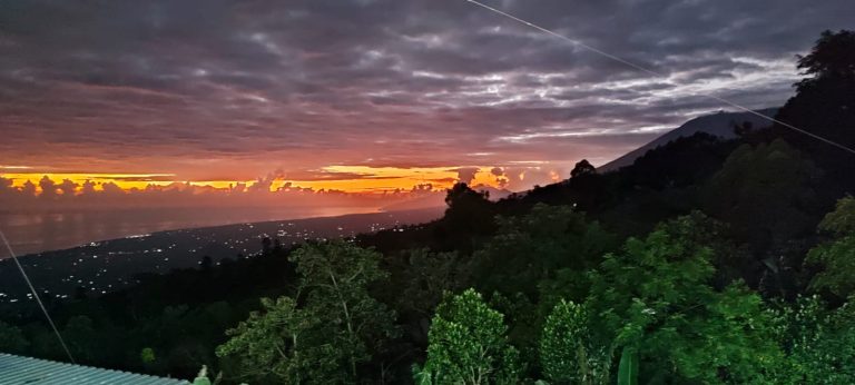 Kini sun rise seperti menjadi saksi bagi pelaksanaan karya agung di Pura Warga Kayuselem, Songan. Pamedek nyaris setiap hari menyempatkan diri menatap wajah langit timur sembari menikmati kopi pagi dari pintu candi bentar pura tersebut. (sum)