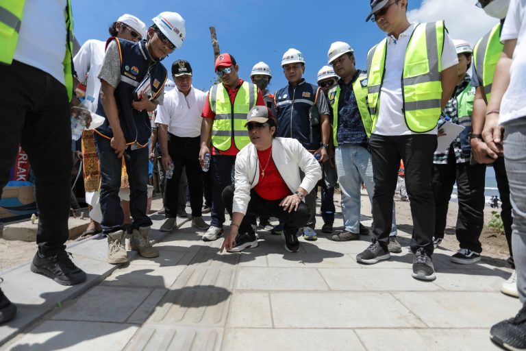 FORUM Keadilan Bali – Bupati Badung Nyoman Giri Prasta didampingi Sekda Wayan Adi Arnawa, Anggota DPRD Badung Gusti Anom Gumanti dan Gusti Lanang Umbara meninjau proyek penataan pantai Seminyak, Legian dan Kuta (Samigita), Sabtu (24/9).