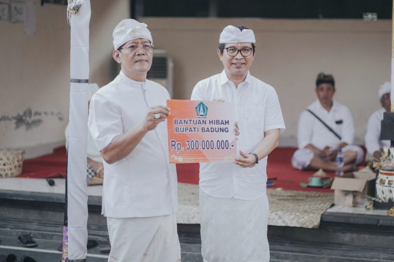 Sekda Badung menyerahkan dana punia Pemkab Badung secara simbolis Rp300 juta kepada manggala karya disaksikan langsung masyarakat pengempon pura setempat.