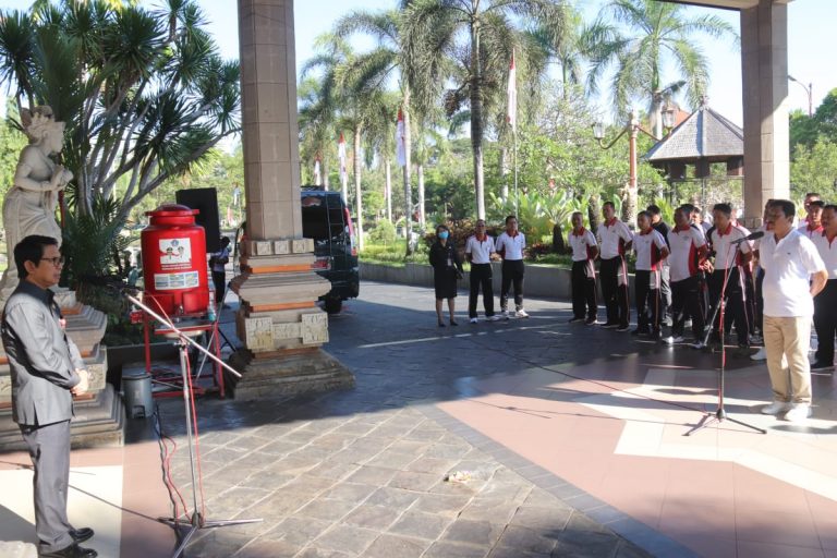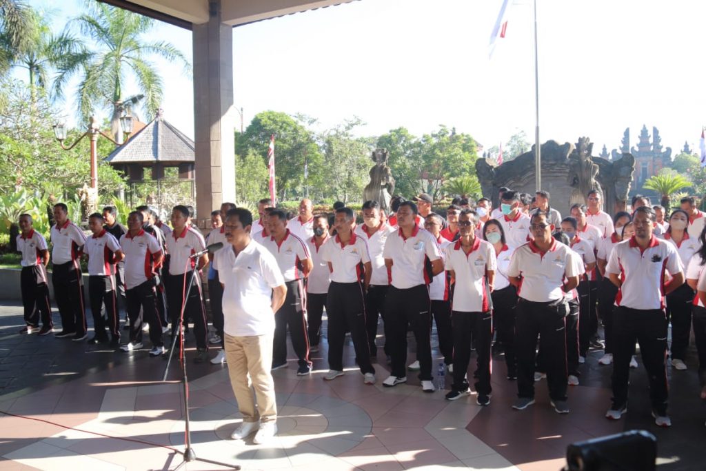 FORUM Keadilan Bali – Sekretaris Daerah (Sekda) Kabupaten Badung I Wayan Adi Arnawa sekaligus sebagai Ketua Korps Pegawai Republik Indonesia (KORPRI) Kabupaten Badung mewakili Bupati Badung melepas kontingen Badan Pembinaan Olahraga (Bapor) KOPPRI yang akan bertanding di Provinsi Bali dalam rangka memeriahkan Hari Ulang Tahun (HUT) Provinsi Bali ke-64 tahun 2022, Jumat (5/8) di Lobi Kantor Bupati Badung.