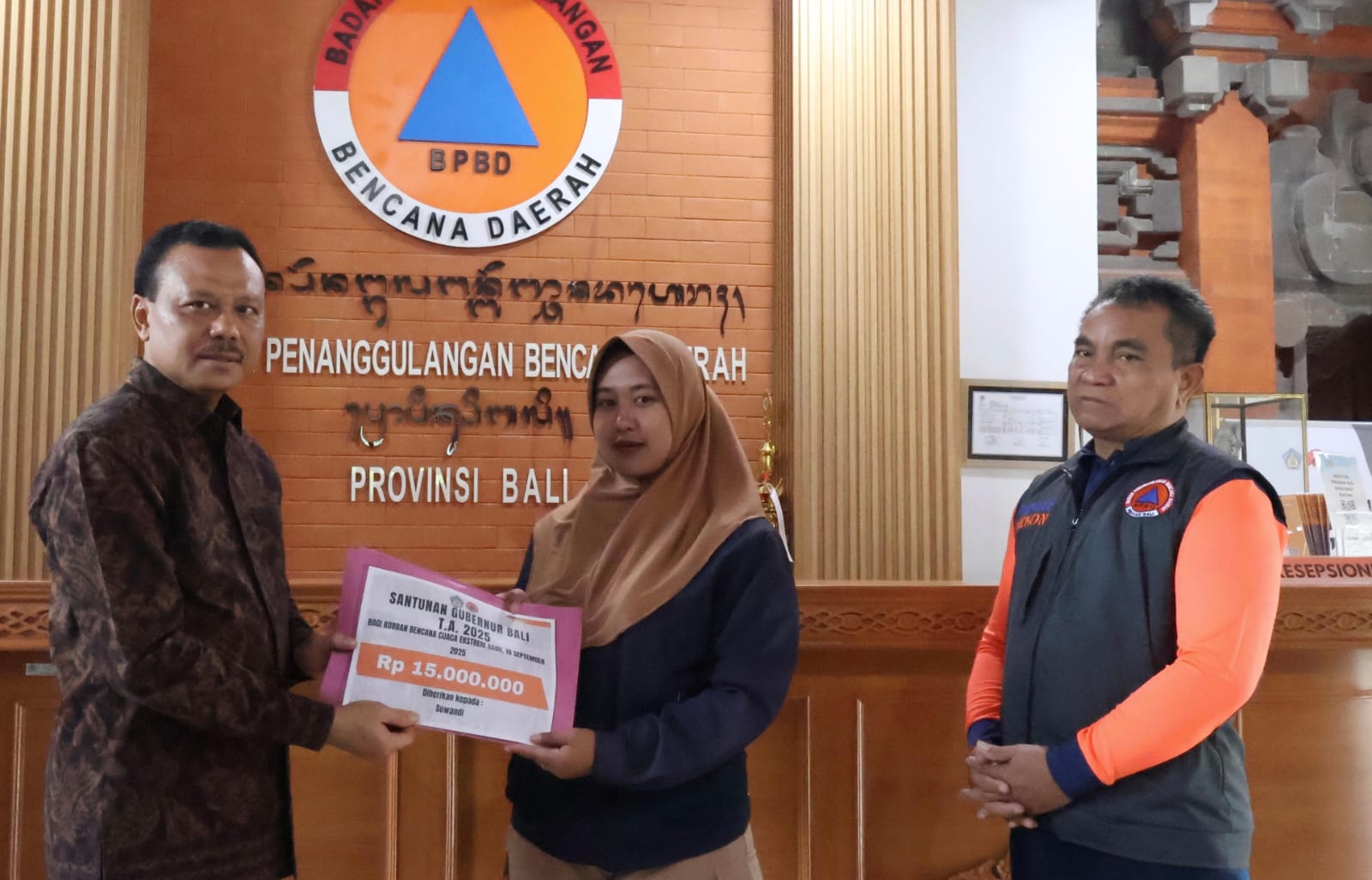 Bantuan berupa santunan sebesar Rp15 juta diserahkan kepada Doa Miftah Ul Suwandi, ahli waris dari almarhum Suwandi. Doa, yang ditemani kakaknya, Bayu Candra Permana menuturkan bahwa ayahnya terseret arus pada 10 September lalu di Perumahan Griya Selaras pada dini hari. Korban ditemukan pada hari keenam, yakni 16 September. Doa dan Bayu menyampaikan terima kasih kepada Pemerintah Provinsi Bali atas bantuan yang diberikan.