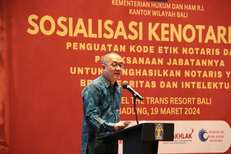 FORUMKeadilanbali.com – Notaris merupakan profesi penting berorientasi pada legalisasi sehingga dapat menjadi fundamen hukum utama tentang status harta benda serta hak dan kewajiban para pihak yang terlibat. Melihat pentingnya peran Notaris, upaya penguatan kode etik guna menghasilkan Notaris berintegritas dan intelektual, Kantor Wilayah Kementerian Hukum dan HAM Bali menyelenggarakan sosialisasi Kenotariatan di The Trans Resort Bali, Selasa (19/3).