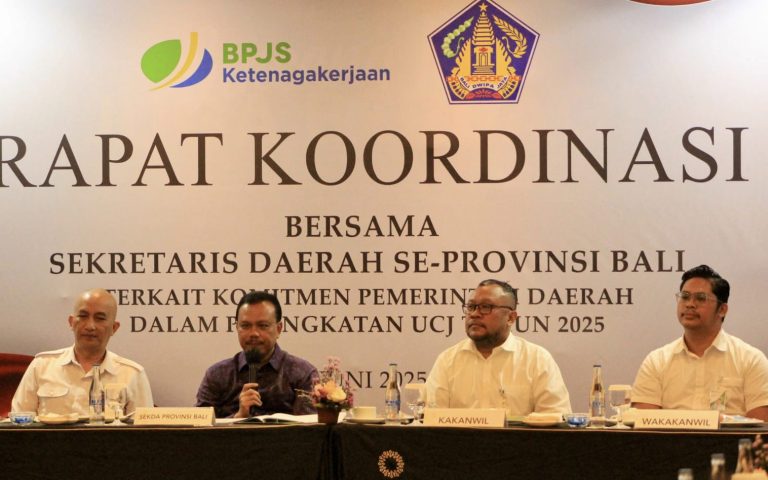 DENPASAR, FORUMKEADILANBali.com – Sekretaris Daerah Provinsi Bali, Dewa Made Indra memimpin rapat koordinasi bersama Sekretaris Daerah se-Provinsi Bali membahas komitmen Pemerintah Daerah dalam peningkatan Universal Coverage Jaminan Sosial Ketenagakerjaan (UCJ) 2025 berlangsung di Four Star by Trans Hotel, Rabu (4/6/2025).