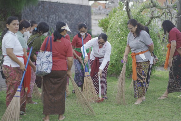 FORUM Keadilan Bali – Sebagai wujud bhakti dan kepedulian terhadap lingkungan, Tim Penggerak (TP) PKK Kabupaten Badung dipimpin Wakil Ketua TP PKK Kabupaten Badung Nyonya Kristiani Suiasa melaksanakan kegiatan bakti sosial bersih-bersih (mereresik) sekaligus melaksanakan persembahyangan bersama di Pura Dhang Kahyangan Gunung Payung, Desa Kutuh, Kecamatan Kuta Selatan, Jumat (15/7).