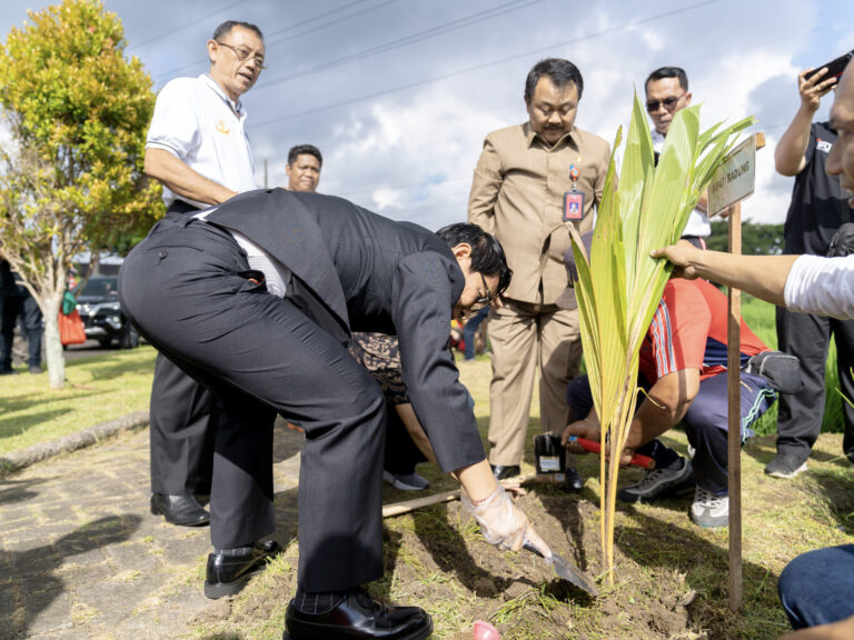 FORUM Keadilan Bali – Serangkaian pelaksanaan penutupan Kirab Pemilu 2024 di Kabupaten Badung, Sekretaris Daerah (Sekda) Kabupaten Badung I Wayan Adi Arnawa menanam pohon kelapa genjah di area Patung Rama Wibisana, Pintu Gerbang Utara Puspem Badung, Jumat (18/8).