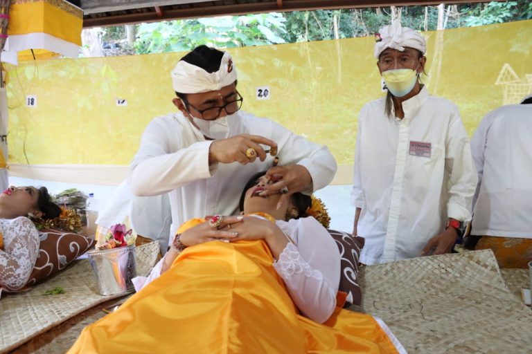FORUM Keadilan Bali – Wali Kota Denpasar I Gusti Ngurah Jaya Negara ”Ngayah Nyangging” rangkaian upacara Atma Wedana Desa Adat Kesiman, Kecamatan Denpasar Timur, Sabtu (20/8) di Pura Dalem Mutering Jagat Kesiman. Prosesi mapandes atau potong gigi dimulai sejak pagi diikuti 609 orang.