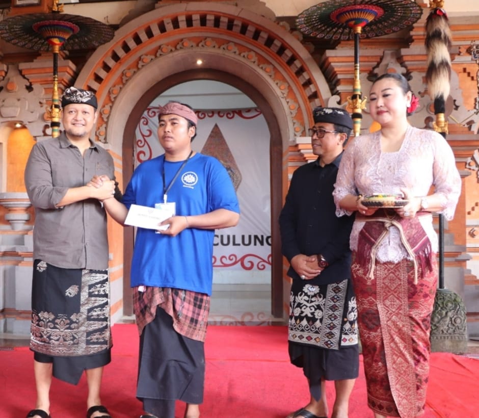 Wabup Bagus Alit Sucipta menyerahkan bantuan dana kreativitas Rp30 juta dan bantuan pribadi Rp5 juta kepada seka gong, diterima Ketua Panitia I Made Angga Saputra.