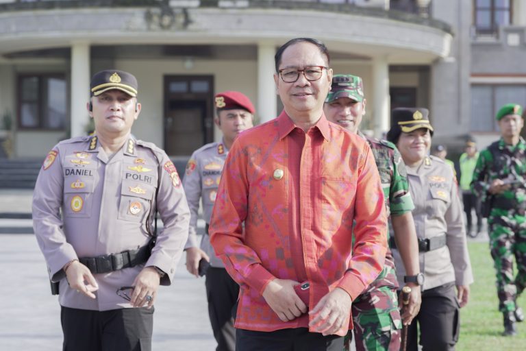 FORUM Keadilan Bali – Menjelang pemilihan umum (Pemilu) tanggal 14 Februari 2024 serta pengaman tempat pemungutan suara (TPS), Forum Komunikasi Pimpinan Daerah (Forkopimda) Kabupaten Badung melaksanakan apel pergeseran pasukan Operasi Mantap Brata Agung 2023-2024 di Lapangan Puspem Badung, Selasa (13/2).