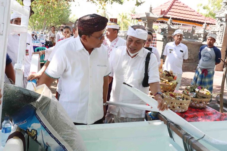 FORUM Keadilan Bali – Wakil Bupati Buleleng I Nyoman Sutjidra menyerahkan tujuh unit sampan fiber dan satu set jaring tasi kepada Kelompok Nelayan Segara Rahayu, di Pantai Desa Banyupoh, Kecamatan Gerokgak, Rabu (13/7).