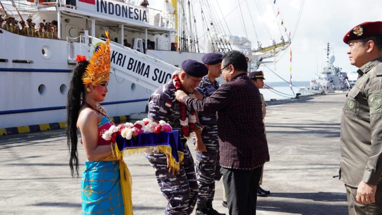 FORUM Keadilan Bali – Wakil Gubernur Bali, Tjokorda Oka Artha Ardhana Sukawati bersama jajaran Forum Komunikasi Pimpinan Daerah (Forkopimda) Bali menyambut kedatangan KRI Bima Suci-945 bersandar di Dermaga Timur Pelabuhan Benoa, Selasa (11/10).