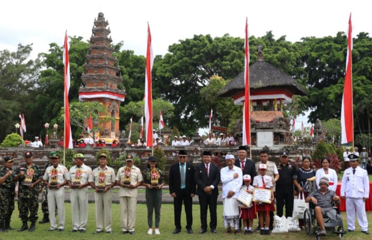 Pj. Gubernur Bali diakhir upacara memberikan penghargaan serta bantuan berupa uang pembinaan kepada murid berprestasi dan kursi roda kepada veteran mengalami cedera permanen saat berjuang melawan penjajah.