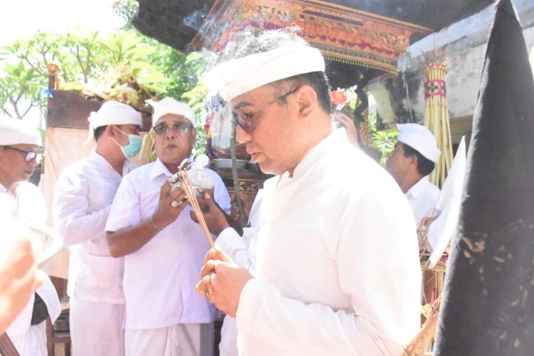 FORUM Keadilan Bali – Wali Kota Denpasar IGN Jaya Negara menghadiri macaru Rsi Gana, Melaspas dan Mendem Pedagingan Banjar Tatasan Kaja, Tonja pada Saniscara Kliwon Wuku Wariga, Sabtu (10/12).