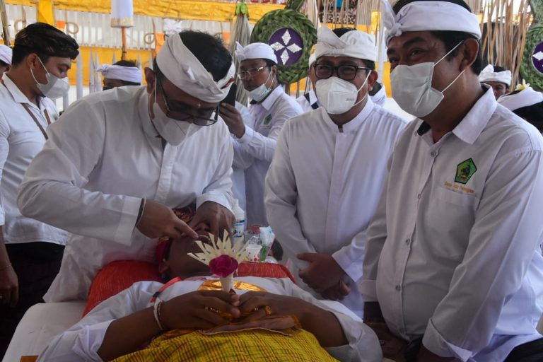 FORUM Keadilan Bali – Wali Kota Denpasar, I Gusti Ngurah Jaya Negara ngayah nyanggingin pada upacara mapandes (potong gigi) serangkaian Karya Manusa Yadnya dan Pitra Yadnya, Desa Adat Pemogan di Peyadnyan, Kawasan Jalan Glogor Carik, Selasa (23/8).
