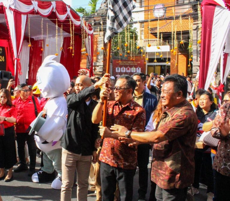 Iring-iringan kirab bendera partai politik Pemilu 2024 tiba di Kota Denpasar pukul 08.00 Wita diiringi tabuh baleganjur, tarian Sekar Jempiring dan Baris Gede. Usai diserahkan, bendera partai politik langsung diarak mengelilingi Lapangan Niti Mandala Renon. Dalam kesempatan tersebut turut dilaksanakan penandatanganan berita acara serah terima serta deklarasi Pemilu sebagai sarana integrasi bangsa. Turut diserahkan pula cinderamata Suara Rakyat (Sura) dan Suara Pemilu (Sulu) merupakan maskot Pemilu serentak 2024.