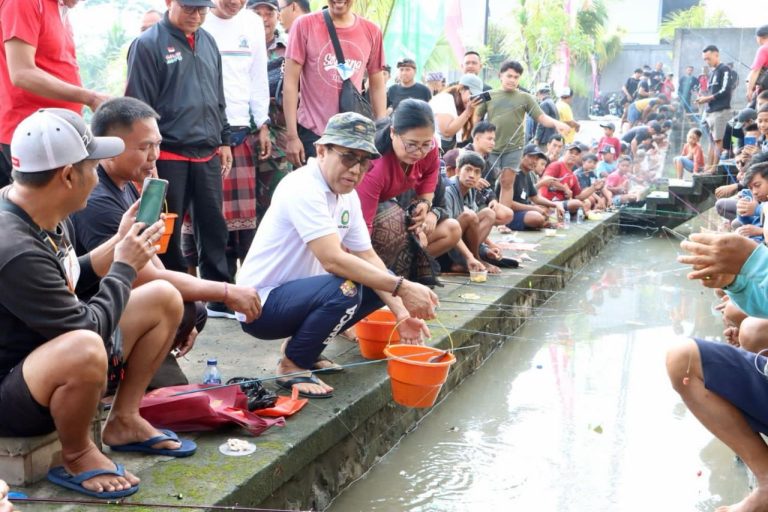 FORUM Keadilan Bali – Walikota Denpasar I Gusti Ngurah Jaya Negara membuka lomba mancing air deras diselenggarakan ST Yowana Tresna Shanti Banjar Paang Kaja, Penatih, Denpasar Timur dengan penebaran ikan lele di saluran irigasi subak Paang kawasan SPPBE PT Chandra Karya Gas, Minggu (28/1).