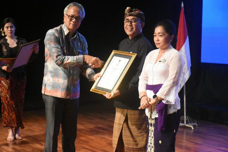 FORUMKEADILANBali.com – Walikota Denpasar I Gusti Ngurah Jaya Negara bersama Ketua TP PKK Ny. Sagung Antari Jaya Negara menerima penghargaan Manggala Karya Kencana pada puncak peringatan Hari Kesatuan Gerak (HKG) TP PKK ke-52 Kota Denpasar di Gedung Dharma Negara Alaya, Selasa (9/7).