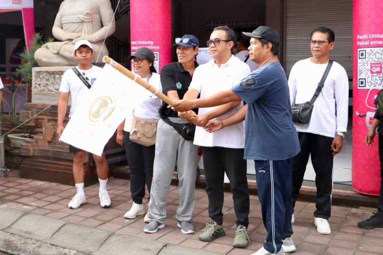 FORUMKADILANBali.com – Walikota Denpasar I Gusti Ngurah Jaya Negara melepas jalan santai STT Bina Putra Banjar Laplap Tengah dengan mengibaskan bendera di depan Balai Banjar Laplap Tengah Penatih Dangin Puri, Denpasar Timur, Minggu (8/12).