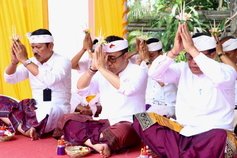 FORUM Keadilan Bali – Walikota Denpasar IGN Jaya Negara didampingi Sekretaris Daerah Kota Denpasar I.B Alit Wiradana serta sejumlah pimpinan OPD sembahyang bersama saat piodalan Padmasana Dinas Perumahan Kawasan Permukiman dan Pertanahan (Perkim) Kota Denpasar, bertepatan Purnama Katiga, Kamis (31/8).