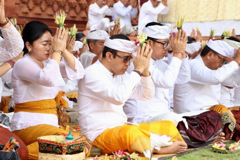 FORUM Keadilan Bali – Walikota Denpasar I Gusti Ngurah Jaya Negara sembahyang bersama Hari Saraswati di Pura Agung Jagatnatha Denpasar dipuput Ida Pedanda Gede Putra Mas, Griya Mas Balun, Sabtu (16/12).