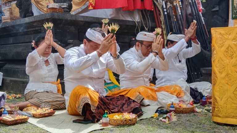FORUM Keadilan Bali – Pemkot Denpasar melaksanakan persembahyangan serangkaian Karya Pujawali Pedudusan Agung yang jatuh pada Purnamaning Kasa di Pura Luhur Candi Narmada Tanah Kilap, Desa Pemogan Denpasar, Rabu (13/7).