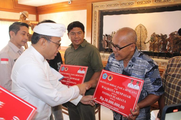 FORUMKEADILANBali.com – Walikota Denpasar I Gusti Ngurah Jaya Negara menyerahkan bantuan sosial pasca bencana dan santunan duka cita dari Pemerintah Kota Denpasar kepada masyarakat terkena musibah, di Kantor Walikota Denpasar, Jumat (20/9).