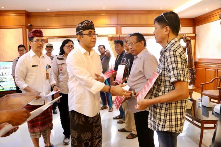 FORUM Keadilan Bali – Walikota Denpasar I Gusti Ngurah Jaya Negara menyerahkan bantuan sosial pasca bencana kepada 6 orang penerima di Kantor Walikota Denpasar, Jumat (29/12).