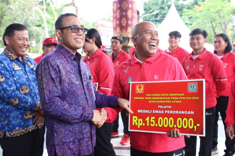 FORUMKEADILANBali.com – Walikota Denpasar I Gusti Ngurah Jaya Negara, menyerahkan dana tali kasih atau bonus kepada atlet dan pelatih asal Kota Denpasar yang berlaga dalam Pekan Olahraga Nasional (PON) Aceh dan Sumatera Utara 2024 di Lobi Gedung Dharma Negara Alaya, Lumintang Denpasar, Selasa, (17/12).