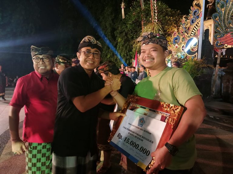 FORUM Keadilan Bali – Wali Kota Denpasar IGN Jaya Negara menyerahkan hadiah kepada penampilan terbaik Parade balagenjur maha bandana Prasadha, Sabtu (12/11).