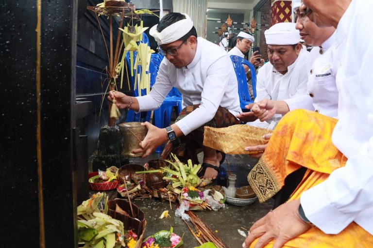FORUMKEADILANBali.com – Wakil Walikota Denpasar, I Kadek Agus Arya Wibawa, sembahyang pada pujawali dirangkiakan pamelaspas tembok panyengker di Banjar Tegallinggah, Padangsambian bertepatan rahina Tumpek Landep, Sabtu (22/2/2025).