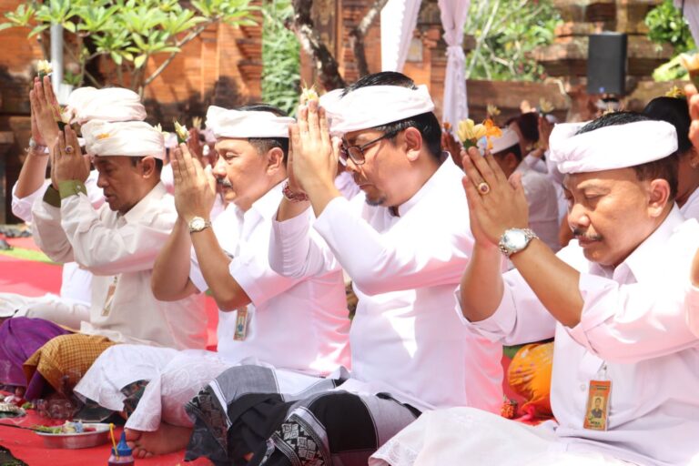 FORUM Keadilan Bali – Wakil Walikota Denpasar I Kadek Agus Arya Wibawa bersama Kepala OPD dan staf dilingkungan Pemkot Denpasar terlihat hadir dan khusyuk mengikuti rentetan Upacara Piodalan Pujawali di Pura Agung Lokanatha Denpasar, Rabu (5/4).