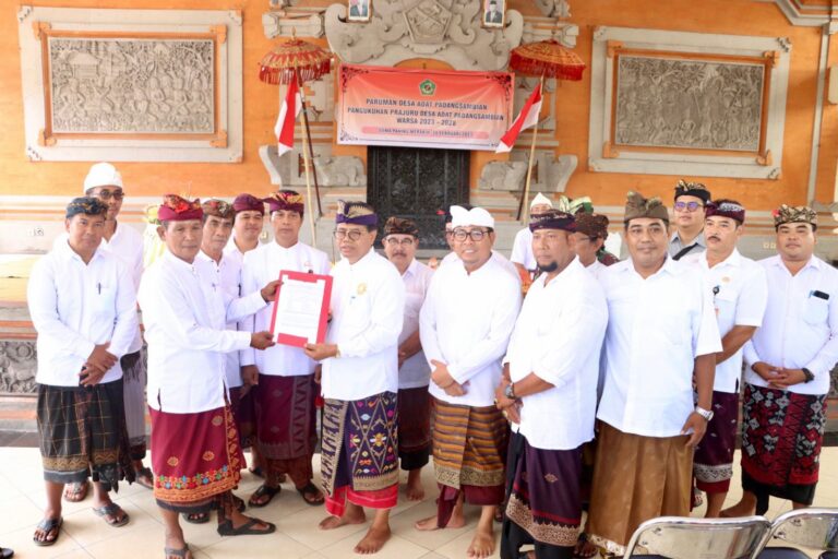 FORUM Keadilan Bali – Wakil Walikota Denpasar, I Kadek Agus Arya Wibawa menghadiri sekaligus menyaksikan pangukuhan prajuru Desa Adat Padangsambian periode 2023-2028 di Wantilan Desa Adat Padangsambian, Senin (20/2).