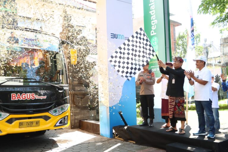 FORUM Keadilan Bali – Wakil Walikota Denpasar I Kadek Agus Arya Wibawa melepas mudik bersama BUMN di PT Pegadaian Kantor Wilayah VII Denpasar di Kantor Pegadaian Renon, Denpasar, Senin (17/4).