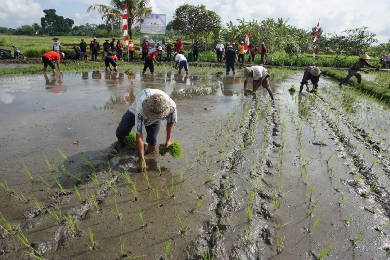 FORUM Keadilan Bali – Mewujudkan ketahanan pangan, Desa Ubung Kaja menanam bibit padi unggul Inpari 32, di Subak Pakel 2, Rabu (31/8).