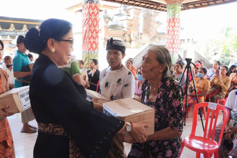 FORUM Keadilan Bali – Ketua TP PKK Provinsi Bali, Ny. Putri Koster didampingi Kepala Dinas Pemberdayaan Masyarakat, Desa, Kependudukan, dan Pencatatan Sipil Provinsi Bali, Putu Anom Agustina menyerahkan bantuan 560 paket sembako kepada 280 orang penerima dari lima Banjar tersebar di Desa Padangsambian Kaja, Kecamatan Denpasar Barat, Kamis (12/1).